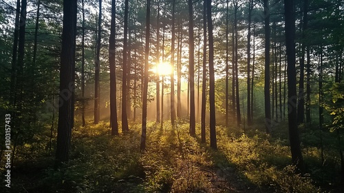 © Kitanari, Fototapeta premium Sunrise in pine forest, misty morning, nature background, peaceful scene