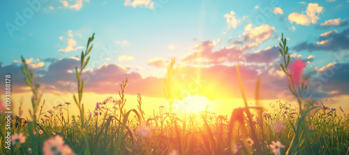 Obraz premium sunrise in the blue sky of spring and plants background 4