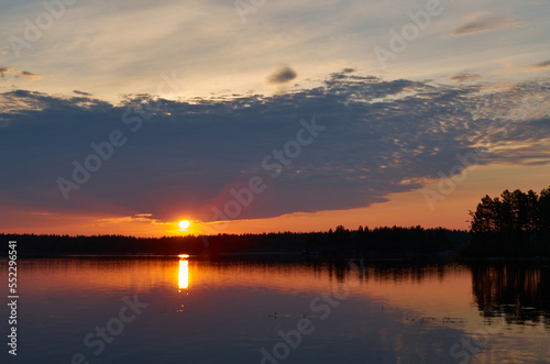© Max, Fototapeta premium Sunrise in the cloudy sky over the water surface