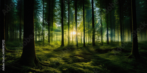 © Art AI Gallery, Obraz premium Sunrise in the dark mysterious forest. Rendering .