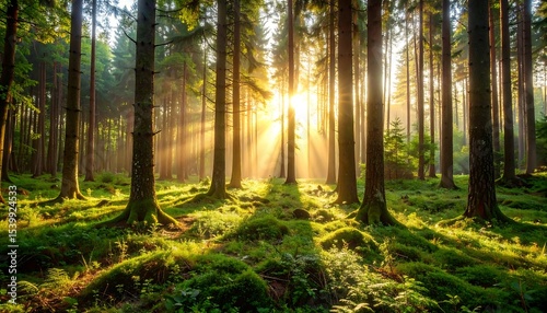 © Puasa, Obraz premium Sunrise in the Pine Forest.
