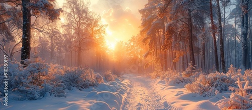 © dinny, Naklejka premium Sunrise in the snowy forest