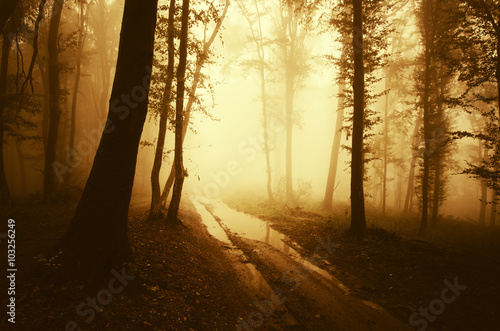 © andreiuc88, Obraz premium sunrise light in foggy forest