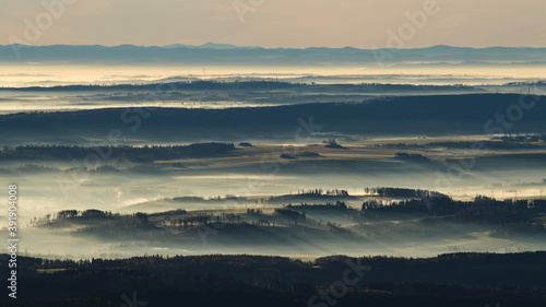 © Radek Vicar, Fototapeta premium Sunrise light rays casting long shadows in the morning mist rolling over hilly landscape with wind turbines peaking from the clouds int he background.