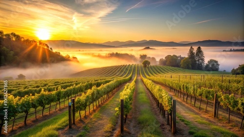 Fototapeta premium Sunrise mist enveloping a scenic California vineyard landscape, sunrise,...