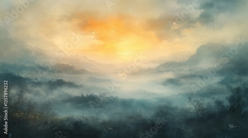 © Roman, Fototapeta premium Sunrise, misty landscape. Generative AI