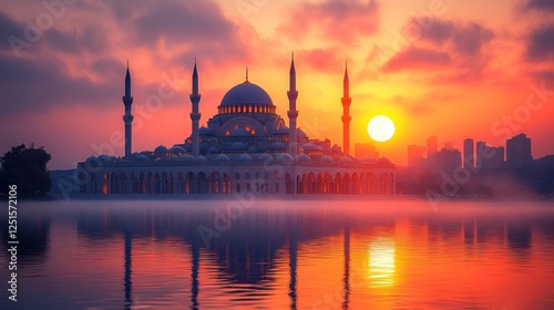 Fototapeta premium Sunrise Mosque Lake Cityscape Reflection