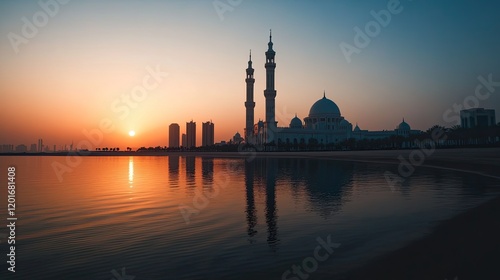 Naklejka premium Sunrise Mosque Reflection Cityscape, Peaceful Dawn