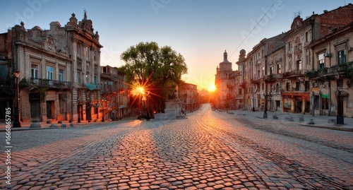 Naklejka premium Sunrise on a cobblestone street. Old buildings line the road