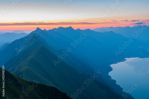 Fototapeta premium Sunrise on Augstmatthorn, painting the sky in gold above Brienzersee. A...
