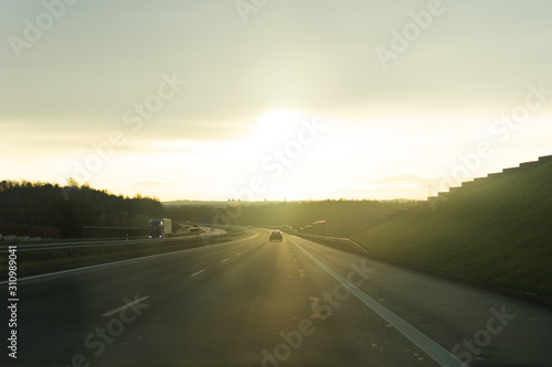 © Inna Dodor, Fototapeta premium Sunrise on the road from the car window.