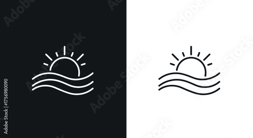Fototapeta premium Sunrise or sunset over ocean waves line art in black and white contrast backgrounds.