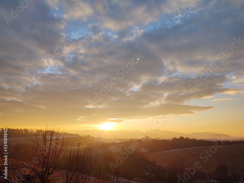 © Valeria, Fototapeta premium Sunrise or sunset over the hills and meadow. Slovakia