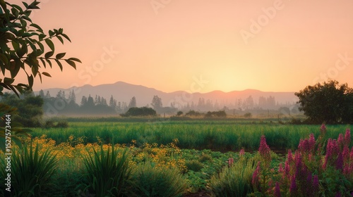 Obraz premium Sunrise Over a Biodiverse Organic Farm with Vibrant Foliage