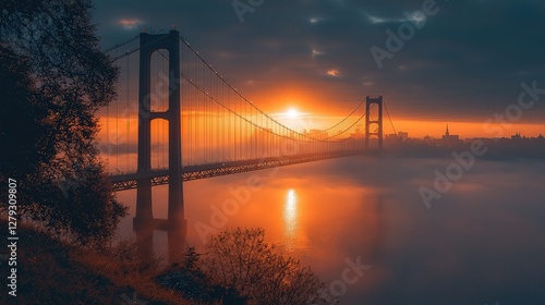 © Raena, Obraz premium Sunrise over a bridge, fog on river, city skyline, tranquil scene, scenic view