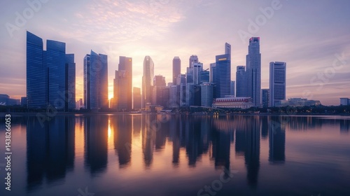 © fatah, Fototapeta premium Sunrise over a bustling city skyline reflected in calm waters