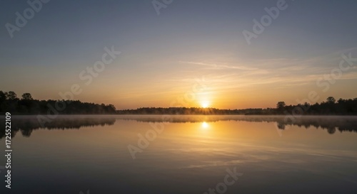 © aby.std, Fototapeta premium Sunrise over a calm lake, hazy morning light reflects on the water. Silhouettes of trees line the shore