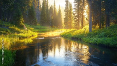 © Rania, Obraz premium Sunrise over a calm river flowing through a lush evergreen forest.