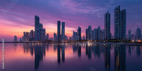 © Boy, Fototapeta premium Sunrise over a city reflected in calm water