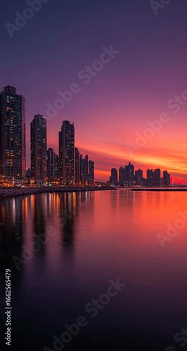 Fototapeta premium Sunrise over a city reflecting in calm water