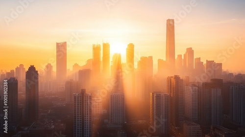 Fototapeta premium Sunrise over a city skyline, with the Sun rays illuminating tall buildings...