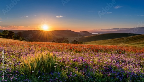 © Madyson, Fototapeta premium sunrise over a colorful wildflower field with hills in the background