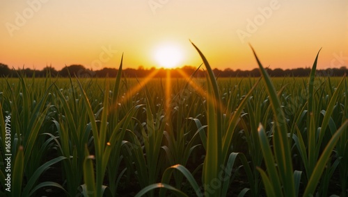 Fototapeta premium Sunrise over a fresh vegetable-filled onion field