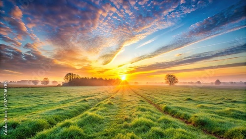 Obraz premium Sunrise over a grassy field in North East Lincolnshire