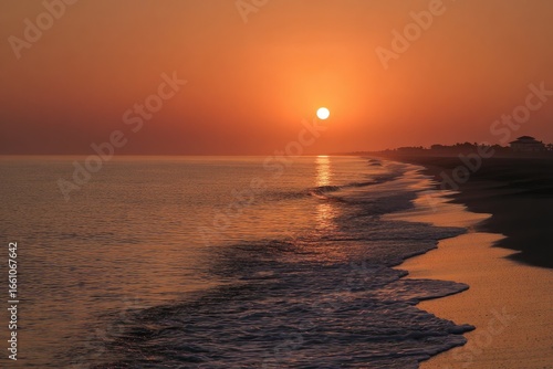 © pires, Naklejka premium Sunrise over a hazy beach, soft colors