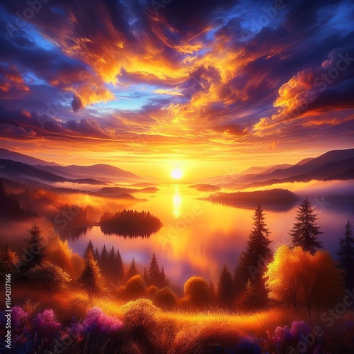 Fototapeta premium Sunrise Over a Lake Warm golden hues blending into cool blues an