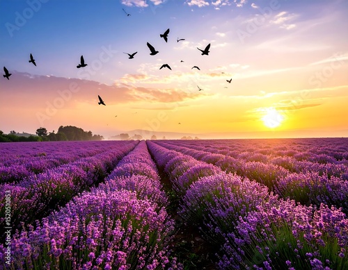 © Sungging, Obraz premium Sunrise over a lavender field with birds