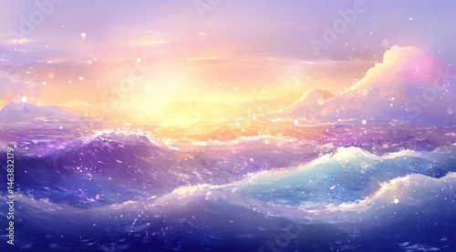 Fototapeta premium Sunrise over a magical ocean. Soft pastel hues, swirling waves, glittering...