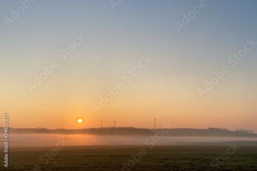 © CassidyTe, Fototapeta premium Sunrise over a meadow with ground fog