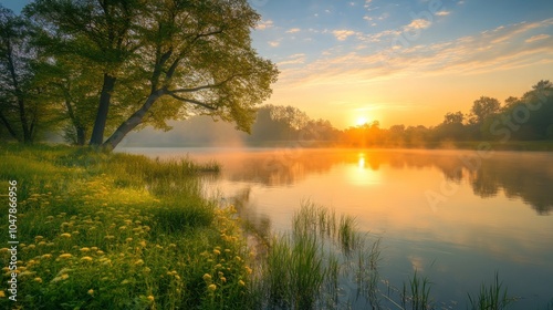 © azkiyanaila taleta, Fototapeta premium Sunrise Over a Misty Lake