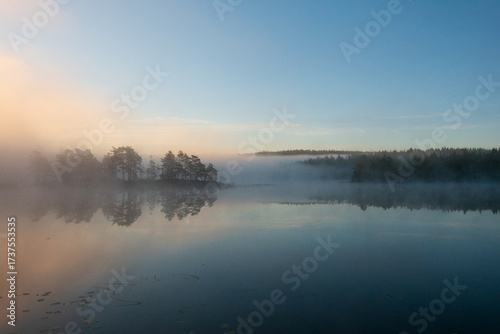 © Matauw, Fototapeta premium Sunrise over a misty lake, a peaceful and mysterious landscape