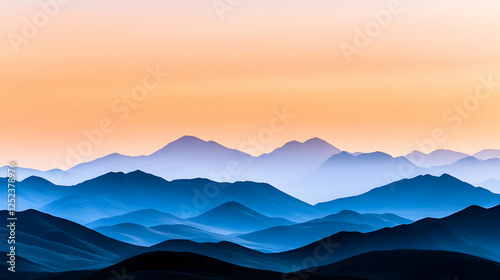 Obraz premium Sunrise over a misty mountain range; serene landscape view; peaceful scene;...