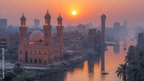 © zulvida, Naklejka premium Sunrise over a mosque and river in a city