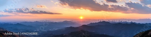 © Critink, Fototapeta premium Sunrise over a mountain range, with hazy valleys and wind turbines visible on the horizon
