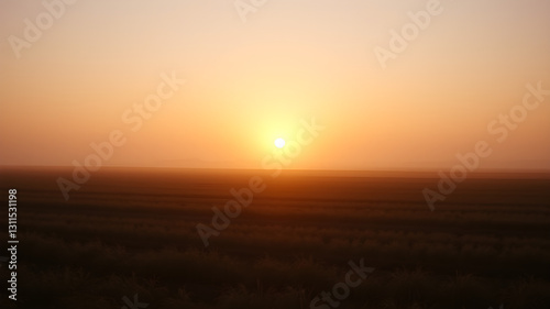 Obraz premium Sunrise over a peaceful meadow, with golden light filtering through the morning mist, creating a serene and dreamy atmosphere.