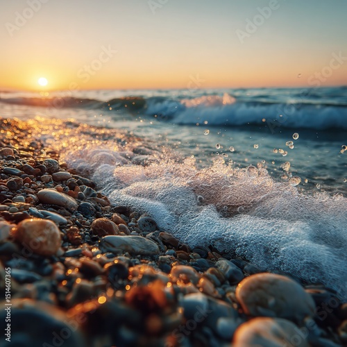 Obraz premium Sunrise Over a Pebble Beach Calm Ocean Waves and Golden Light.