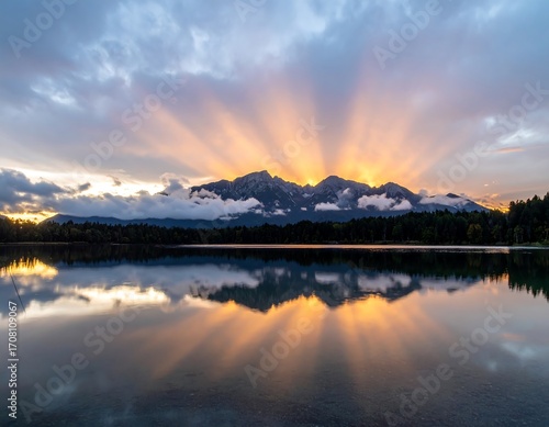 Fototapeta premium Sunrise over a serene lake reflecting a mountain range