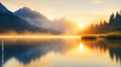 Fototapeta premium Sunrise over a serene mountain lake, mist rising with warm sunlight, nature’s...