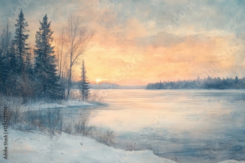 © ChaoticMind, Fototapeta premium Sunrise over a serene winter lake surrounded by evergreen trees and soft snow