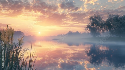 Fototapeta premium Sunrise over a tranquil lake mist rising