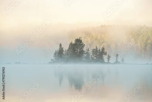 © Marko, Fototapeta premium Sunrise over a tranquil lake with a small island, shrouded in mist