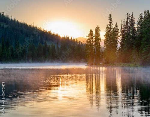 © Ranta Images, Fototapeta premium Sunrise over a tranquil mountain lake mist rising from the water