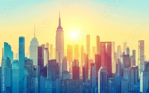 Fototapeta premium Sunrise over a vibrant New York City skyline with towering skyscrapers and warm colors