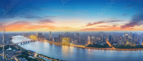 © evening_tao, Fototapeta premium Sunrise Over Bustling City Skyline Panorama