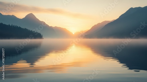 © Fightstar, Obraz premium Sunrise over calm lake with rugged mountains and pastel sky