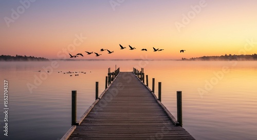 © selina, Obraz premium Sunrise over calm lake with wooden pier